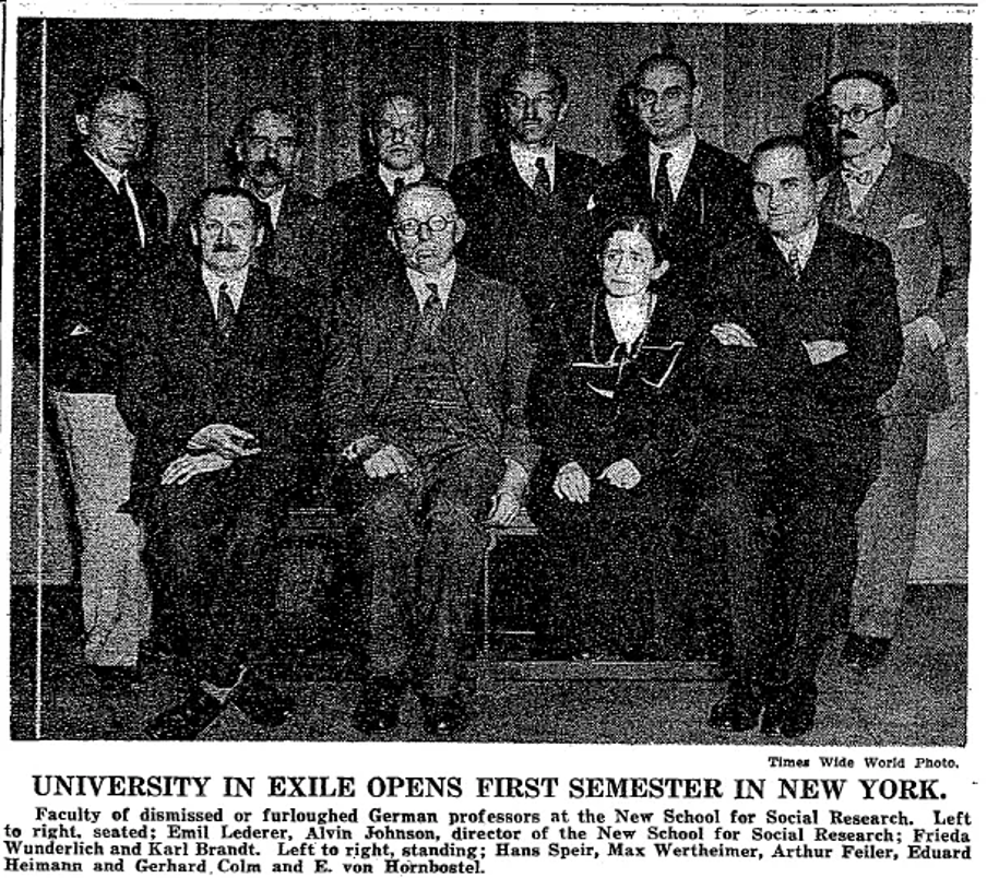 Before the Nazis came to power, German universities were global intellectual leaders, and this new affiliation with leading academics gave The New School, which had been founded just 15 years earlier, a huge boost. Erich Fromm, Max Wertheimer, and Aron Gurwitsch were among those who relocated to the United States. After the war, Hannah Arendt joined the faculty, and Ernst Bloch attended weekly seminars.