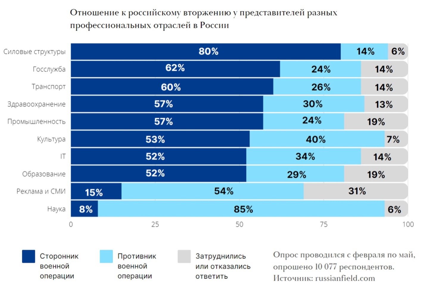 Опрос независимой социологической группы Russian Field весной 2022 года показал, что в тот момент как раз ученые – в отличие от представителей других профессиональных групп – были наиболее последовательными критиками войны.