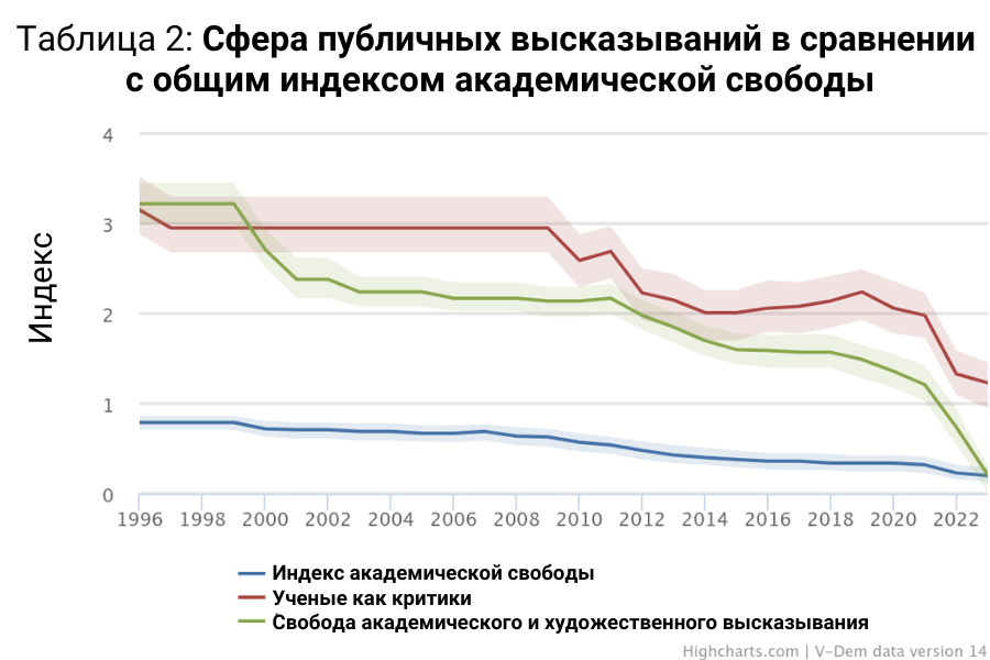 В целом же в это же время заметно падает активность и роль ученых в публичной сфере. Также усиливаются репрессии за независимые суждения преподавателей и студентов, аффилированных с государственными институциями. Еще до возвращения Путина на пост президента РФ уровень академической свободы высказывания продолжал ухудшаться (Таблица 2).