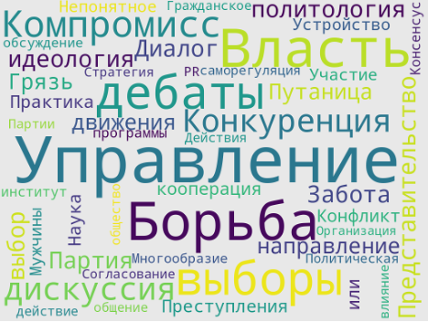Политика. Более заметна разница в динамике понимания политики. До курса слушатели ассоциировали этот термин с управлением, борьбой, властью, дебатами и компромиссом.