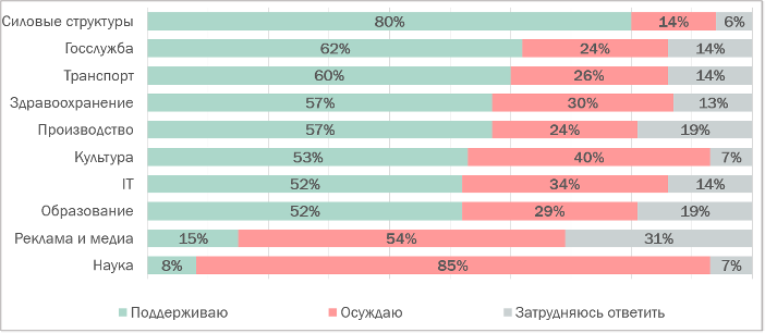 Рисунок 2. Отношение к началу войны против Украины среди представителей различных профессиональных сообществ в России (февраль-май 2022, N = 10077)
