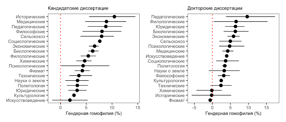 На рисунке можно увидеть значения гендерной гомофилии для научных областей и их доверительные интервалы. Положительные значения показывают, что в этих областях авторы и руководители одного пола склонны работать вместе. Отрицательные значения показывают, что авторы и руководители разного пола склонны работать вместе. Значение 0 означает, что авторы любого пола имеют равные шансы на совместную работу с руководителем любого пола.