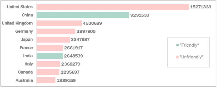 Figure 1. Top 10 countries in the Scimago Journal & Country Rank (by total number of articles published, 1996-2022) and their status as “friendly” or “unfriendly” to Russia