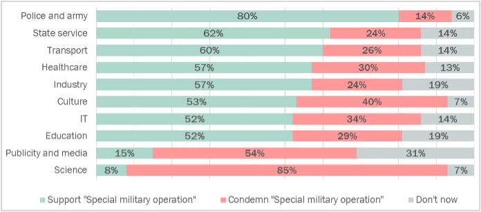Figure 2. Attitudes toward the start of the war against Ukraine among representatives of various professional communities in Russia (February-May 2022, N = 10077)